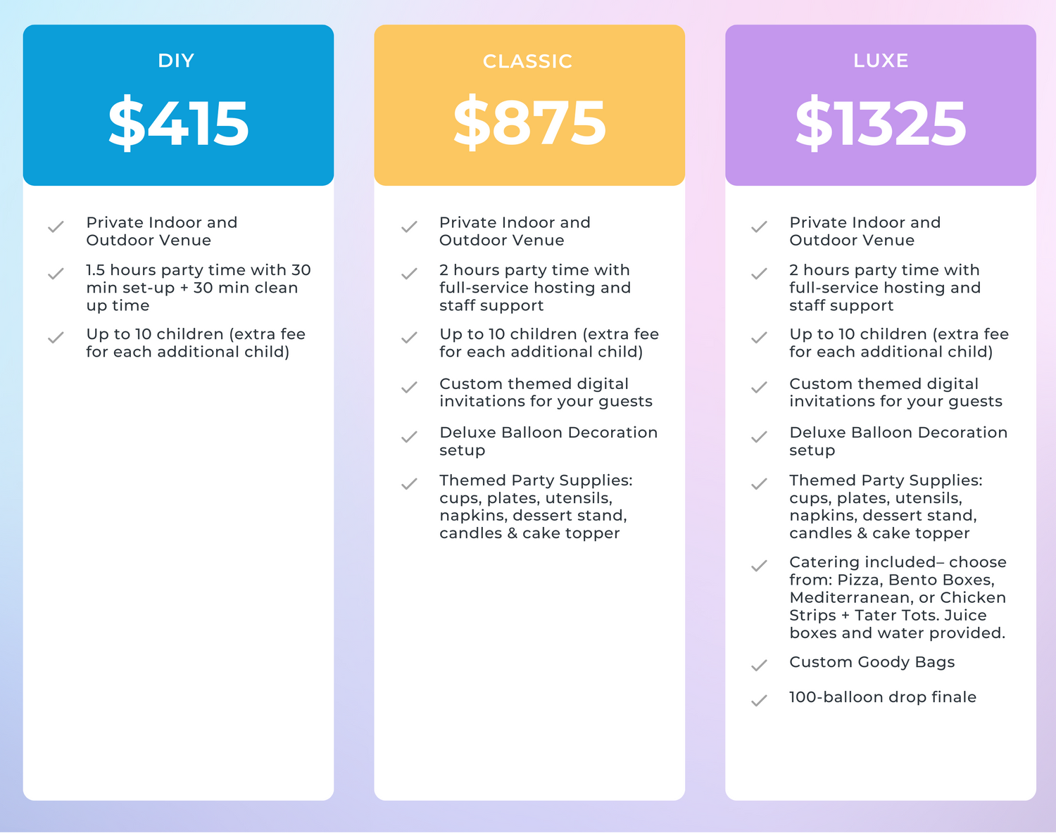 Our party packages include setup, cleanup, and everything in between, so you can relax and enjoy the day along with your child. Our team will work with you to create the perfect celebration, including decor, party favors, and refreshments that match your chosen theme.